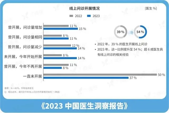 根據(jù)《2023 中國醫(yī)生全景洞察報告》數(shù)據(jù)表示,線上問診的滲透率正在逐步提高,由去年的39%提升至今年的54%,僅有不到四成醫(yī)生從未嘗試過線上問診。