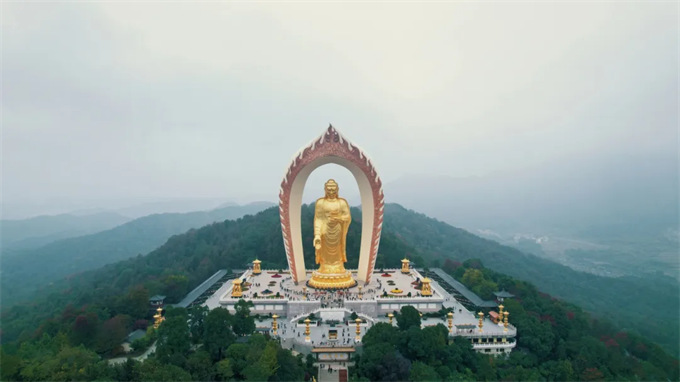 48米高的東林大佛,屹立在高山之巔,是中國少有的露天阿彌陀佛銅像。拾階而上,走過信愿路,拜過蓮花臺,跨越接引橋,登頂極樂路,來到圣象腳下,感受風(fēng)間云動,感悟內(nèi)心滄海。