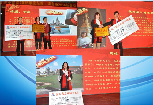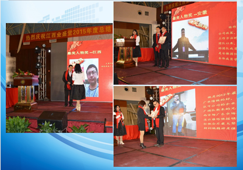 接下來(lái)業(yè)盛堂運(yùn)營(yíng)總監(jiān)做2015年年度工作匯報(bào)與總結(jié),隨后由銷售總監(jiān)馬海燕女士宣布獲得2015年人物獎(jiǎng)和優(yōu)秀團(tuán)隊(duì)獎(jiǎng)以及優(yōu)秀省總?cè)藛T名單,會(huì)議總共頒發(fā)了20個(gè)人物獎(jiǎng)和9個(gè)團(tuán)隊(duì)獎(jiǎng)以及5個(gè)優(yōu)秀省總獎(jiǎng)。公司領(lǐng)導(dǎo)號(hào)召全體員工向他們學(xué)習(xí),學(xué)習(xí)他們?cè)诟髯詬徫簧媳M職盡責(zé)、任勞任怨,特別是舍小我顧大局的團(tuán)隊(duì)精神!并鼓勵(lì)他們戒驕戒躁,在新的一年起到模范帶頭作用。