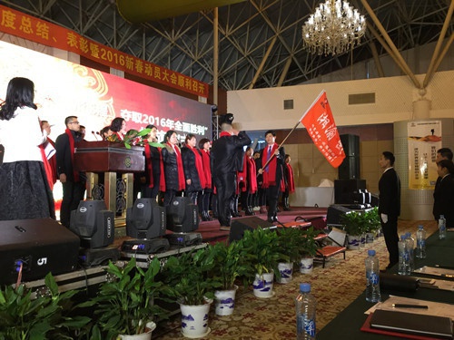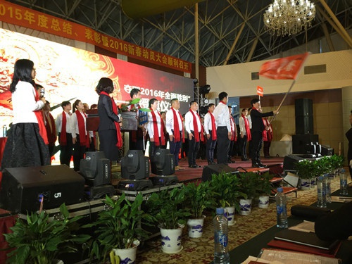 下午重頭戲是各省的風(fēng)采展以及莊嚴(yán)的授旗儀式,授旗是由公司董事長(zhǎng)曾水泉先生將各省的團(tuán)旗授予各省,希望各省以星星之火可以燎原之勢(shì)搶占市場(chǎng)擴(kuò)大規(guī)模。